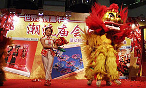 時(shí)近春節(jié),以現(xiàn)代潮流著稱的北京東方廣場(chǎng)將中國(guó)傳統(tǒng)廟會(huì)形式搬入東方新天地商城內(nèi),以營(yíng)造濃濃的中國(guó)民俗風(fēng)情。圖為商城內(nèi)進(jìn)行的舞獅表演。甄雪原攝