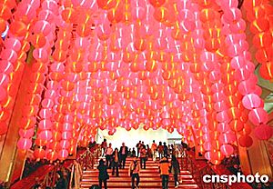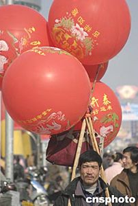春節(jié)臨近,江蘇走街串巷的貨郎趁著年關(guān)人們購(gòu)置年貨的機(jī)會(huì),扛著高高的氣球穿行于街道,等待著買賣的到來(lái)。中新社記者:高遠(yuǎn)