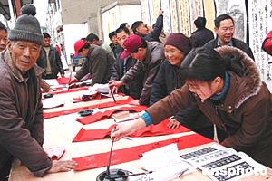 河南許昌尚集鎮(zhèn)書(shū)畫村的農(nóng)民書(shū)法家們?yōu)榇迕窳x寫春聯(lián)。尚集鎮(zhèn)民風(fēng)古樸,文化氛圍濃厚,一直保留著習(xí)書(shū)的傳統(tǒng)。作者:慎重