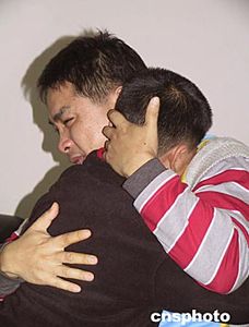 因涉嫌在海南從事間諜活動被拘押的臺灣人宋孝濂在海南看守所與前來探視的兒子宋睿庭相抱痛哭。作者:王辛莉