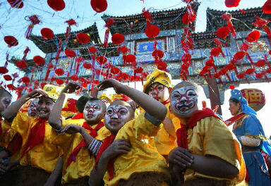 中國京劇中的“金猴”為北京地壇廟會增添喜慶氣氛。逛廟會是北京傳統(tǒng)的游園活動。