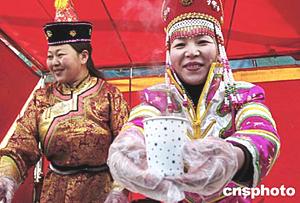來(lái)自中國(guó)內(nèi)蒙古錫林郭勒草原的姑娘烏云格日格(右)與嫂子道日娜,春節(jié)期間來(lái)到北京參加廠甸春節(jié)廟會(huì),經(jīng)營(yíng)內(nèi)蒙古草原風(fēng)味小吃,并高興地向來(lái)賓捧上一杯杯香噴噴、熱騰騰的奶茶。中新社記者:鄒憲