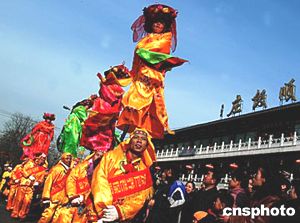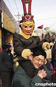 北京城南的春節(jié)廟會(huì)上,山西省大同地區(qū)民間特有的“撓擱”表演吸引無(wú)數(shù)市民追隨觀看。中新社記者:王麗南