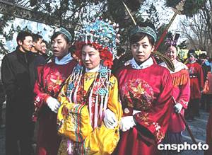 以中國(guó)古典名著《紅樓夢(mèng)》為題材建設(shè)的北京大觀園公園,農(nóng)歷春節(jié)期間舉行“元妃”省親大游行,一所中學(xué)的學(xué)生裝扮成《紅樓夢(mèng)》中的宮女陪“元春”游園。中新社記者:王麗南