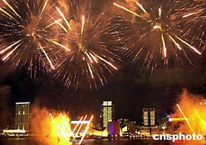 除煙花匯演外,香港新界工商業(yè)總會還在會展中心舉行新春酒會,行政長官董建華、中央政府駐港聯(lián)絡辦副主任周俊明、外交部駐港特派員楊文昌等出席今晚的活動。