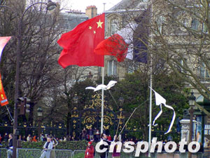 今天的香榭麗舍大街,兩旁編插的中法兩國巨幅國旗招展,中國紅燈籠和彩旗分外醒目,高音喇叭里播送著北京—巴黎大游行的中法文主題曲。法國人扶老攜幼,早早地在香榭麗舍大道兩旁排起了長陣,其中有的還從萬里之遙的法屬圭亞那專程乘飛機(jī)而來。