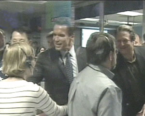中新網(wǎng)1月25日電 據(jù)美國(guó)有線新聞網(wǎng)消息,美國(guó)加州州長(zhǎng)施瓦辛格在“機(jī)遇”號(hào)火星探測(cè)器成功登陸火星后,親臨指揮室向現(xiàn)場(chǎng)人員表示祝賀。