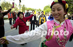新春佳節(jié),深圳民俗文化村里的大廟會好戲連臺、百藝薈萃,游客在此盡興狂歡過大年。圖為游客與藏族演員一起跳藏族舞蹈。作者:陳文