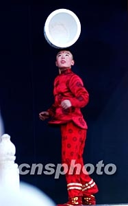 一名十歲的山西兒童春節(jié)期間在北京廟會(huì)上從容表演雜技“頂壇”。據(jù)悉,在中國(guó)民間有許多孩子從五歲左右開始習(xí)練雜技藝術(shù),小小年紀(jì)便已身懷“絕技”。中新社記者:王麗南