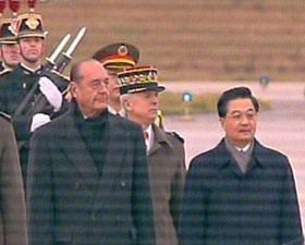 中國國家主席胡錦濤乘專機(jī)于巴黎時間下午兩點(diǎn)四十分抵達(dá)巴黎奧利機(jī)場,開始對法國進(jìn)行國事訪問,法國總統(tǒng)希拉克夫婦親自到機(jī)場迎接。(電視截圖)