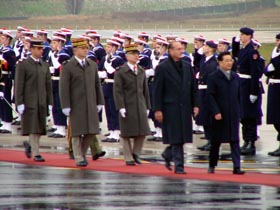 中國國家主席胡錦濤乘專機于巴黎時間下午兩點四十分抵達巴黎奧利機場,開始對法國進行國事訪問,法國總統(tǒng)希拉克夫婦親自到機場迎接。圖為胡錦濤在希拉克陪同下,檢閱法國三軍儀仗隊。