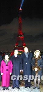 一月二十七日是中法建交四十周年紀(jì)念日,中國國家主席胡錦濤伉儷和法國總統(tǒng)希拉克夫婦二十七日晚上在法國巴黎埃菲爾鐵塔前留影紀(jì)念,該塔自二十四日晚開始至二十九日凌晨止,為表達(dá)法國對中國文化傳統(tǒng)的敬意,而舉行“鐵塔映紅”活動——鐵塔被紅色射燈裝扮成了一座代表中國的“紅塔”。作者:成丁