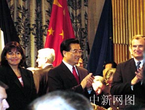 上午十一時(shí)半,在軍樂隊(duì)和儀仗隊(duì)的列隊(duì)引導(dǎo)下,胡錦濤主席健步邁入巴黎市政廳燈火輝煌的節(jié)日大廳,受到巴黎市官員、議員、各國駐法使節(jié)等一千多各界人士的鼓掌歡迎。