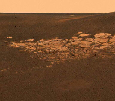 1月28日美國宇航局公布了利用“機遇”號火星車發(fā)回的數(shù)據(jù)合成的照片。這張高清晰度的火星照片清晰地記錄了裸露在火星地表的巖床!皺C遇”號預(yù)計將在下周鉆出著陸艙,開始火星漫步探測。