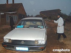 疫區(qū)工作人員對出入車輛進行嚴格消毒。作者:艾啟平 徐晶波