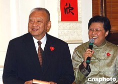 香港立法會(huì)議員與行政長(zhǎng)官董建華、行政會(huì)議成員及政府高官,一月三十日在立法會(huì)大樓宴會(huì)聽(tīng)歡聚一堂,共享新春午宴,圖為董建華與立法會(huì)主席范徐麗泰為“趣怪立法會(huì)”選舉游戲得獎(jiǎng)?wù)哳C獎(jiǎng)。作者:潘索菲