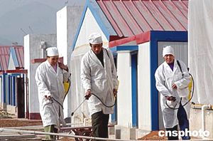 北京農(nóng)業(yè)職業(yè)學(xué)院種雞場的員工對雞舍及周邊進(jìn)行嚴(yán)格消毒,以防止禽流感發(fā)生。中新社記者:張宇