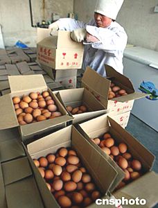 北京一家養(yǎng)雞場的工人對出場雞蛋進(jìn)行嚴(yán)格檢查、檢疫,以確保市民吃上放心蛋。目前,首都工商、衛(wèi)生等部門加強對市場活禽和相關(guān)禽類產(chǎn)品的檢查,以防禽流感。中新社記者:宋吉河