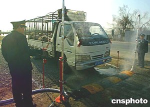 北京市相關(guān)執(zhí)法人員對外地進(jìn)京車輛進(jìn)行消毒,以預(yù)防禽流感。目前,北京市各相關(guān)部門采取積極措施,落實市政府“檢查關(guān)口前移,預(yù)防重點下移,嚴(yán)防死守”的預(yù)防禽流感要求。中新社記者:宋吉河