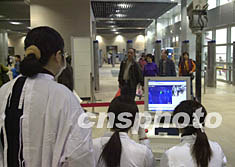 澳門新關(guān)閘邊檢大樓二日開始啟用,新的出入境大廳使用了許多先進(jìn)的設(shè)備,圖為入境大廳使用的測溫設(shè)備在入境人員不留意間已經(jīng)將體溫測出。中新社記者:李剛