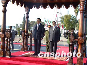 三日下午,胡錦濤抵達阿爾及爾,開始他此次歐非四國之行的最后一站。傍晚,當胡錦濤來到位于阿爾及爾市郊穆拉迪高地的總統(tǒng)府時,總統(tǒng)府儀仗隊持槍敬禮,軍樂隊奏起歡迎曲。在胡錦濤檢閱了總統(tǒng)府儀仗隊后,等候在門前的布特弗利卡迎上前去,與胡錦濤熱烈握手歡迎。這是自去年法國埃維昂南北領導人非正式對話會后,胡錦濤同布特弗利卡的第二次會晤。