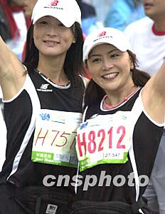 “渣打馬拉松2004”二月八日在香港舉行,萬人冒雨參加了比賽,圖為兩名參賽女士賽后興高采烈拍照。 作者:錢興強(qiáng)