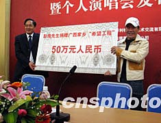 二月九日,祖籍廣西天等縣的臺(tái)灣歌手趙傳(左)在南寧市捐資五十萬(wàn)元人民幣,幫助天等縣龍茗中學(xué)改善教學(xué)環(huán)境。作者:唐安軍