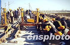 二月九日,京廣線鄭州段雙橋車站正在安裝目前中國國內(nèi)最先進(jìn)的鐵路提速道岔。列車通過此道岔的時(shí)速將由過去的四十公里提高到八十公里,并且沒有咔嚓聲。作者:慎重