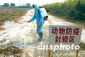 中國內(nèi)地首發(fā)禽流感疫點(diǎn)--隆安縣丁當(dāng)電灌站入口二月十二日工作人員在定時(shí)消毒。疫情發(fā)生后,這里嚴(yán)格按照規(guī)定進(jìn)行定時(shí)消毒。中新社記者:宋吉河
