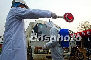 記者今天隨國務(wù)院新聞辦組織的中外記者團前往南寧興寧區(qū)疑似禽流感疫區(qū)采訪,汽車行駛十分鐘后,速度忽然減慢,記者看到,在進入興寧區(qū)的一個路口,六位身穿隔離服,背著噴霧器的工作人員正仔細地為進出的每一輛車進行消毒。