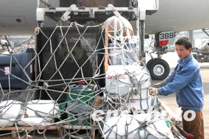 記者在成都機(jī)場(chǎng)貨運(yùn)出口看到,大熊貓“華美”安靜地坐在自己的籠子里,它時(shí)而漫不經(jīng)心地看著外面為給它拍照而擠作一團(tuán)的記者們,時(shí)而低頭悠閑地吃著從美國(guó)帶回的美味“洋竹”!叭A美”隨身帶有十三件行李。在它的行李中裝的全是它平時(shí)吃的玩的,有美國(guó)竹子、餅干、飲用水等。最引人注目的是還是“華美”愛玩的棕色大皮球。
