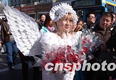 二月十四日情人節(jié),一名打扮成天使模樣的女青年在北京鬧市兜售玫瑰花。盡管情人節(jié)玫瑰花旺銷,但賣花者大增,使得競爭加劇,加上玫瑰花價格不菲,所以零售生意并不好做。中新社記者:張煒