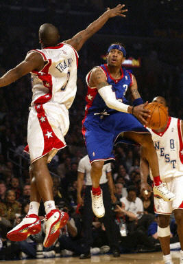 洛杉磯湖人隊(duì)的艾弗森在對(duì)戰(zhàn)西部全明星隊(duì)的弗朗西斯,兩名小個(gè)子球員上演空中舞蹈。