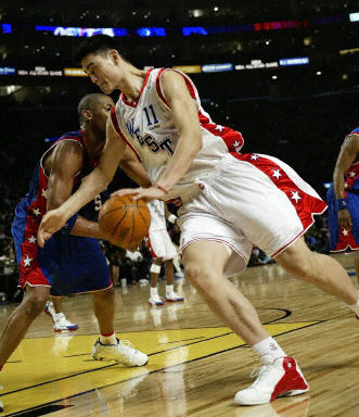 北京時(shí)間今天上午,NBA全明星賽在洛杉磯開(kāi)戰(zhàn),中國(guó)球員姚明所效力的西部全明星隊(duì)以136-132擊敗了東部全明星隊(duì)。圖為姚明在比賽中帶球突破。