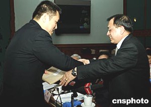 北京政協(xié)的香港、澳門委員2月17日與北京市代市長王岐山等高官座談。不少委員均關(guān)注正月十五密云發(fā)生的多人死亡事件,香港的馮柏棟委員(右)向北京市副市長張茅遞交了香港處理1993年蘭桂坊元旦悲劇調(diào)查及改進(jìn)方案。中新社記者:任晨鳴