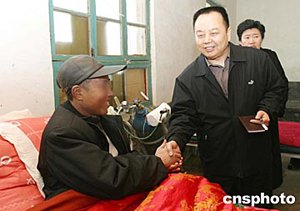 二月十九日,作為河南省駐艾滋病疫情高發(fā)村幫扶工作組成員的陳瑞軍,在上蔡縣文樓村同艾滋病人握手。陳瑞軍是河南省衛(wèi)生廳疾控處調(diào)研員,在今后的一年中他將和艾滋病患者同吃同住,為他們的衣食住行和疾病提供救助和救治。作者:慎重