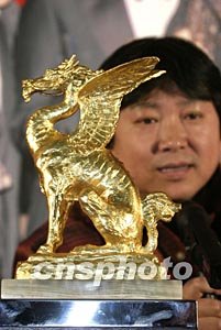 二月二十四日,獲得東京電影節(jié)“金麒麟”大獎的國產(chǎn)影片《暖》舉行媒體看片會,這部影片近期將在北京新開辟的藝術(shù)精品院線上映。圖為出席看片會的導(dǎo)演霍建起和金麒麟大獎。作者:高遠(yuǎn)