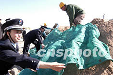 二月二十五日,北京再次刮起六級(jí)大風(fēng),朝陽(yáng)城市管理監(jiān)察大隊(duì)太陽(yáng)宮分隊(duì)對(duì)轄區(qū)內(nèi)部分施工工地的“揚(yáng)沙、粉塵”現(xiàn)象檢查,監(jiān)督施工部門嚴(yán)密覆蓋裸露土渣,減少對(duì)空氣的污染。中新社記者:任海霞