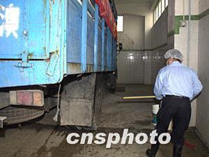圖為裝載著禽類產(chǎn)品的運輸車輛在進(jìn)入澳門南粵批發(fā)市場后,工作人員為車輛進(jìn)行消毒。