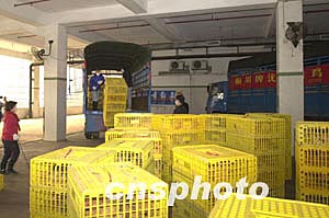 圖為澳門南粵批發(fā)市場的工作人員將首批活雞運進(jìn)場內(nèi)。