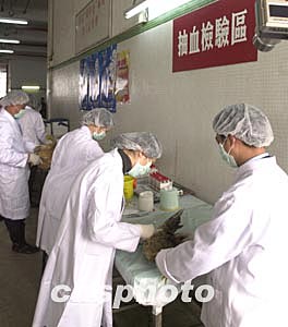 圖為在澳門南粵批發(fā)市場,醫(yī)務(wù)人員當(dāng)場將雞只抽血檢驗。