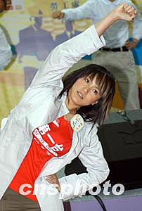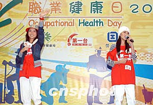 歌星何韻詩3月6日在香港出席由職安局及勞工處舉辦之《職安健康日2004》開幕典禮活動,「職安領(lǐng)隊」何韻詩帶領(lǐng)出席嘉賓及歌星進(jìn)行健康操,宣揚職業(yè)安全信息。作者:鄧慶樂