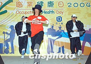 歌星麥浚龍3月6日在香港出席由職安局及勞工處舉辦之《職安健康日2004》開幕典禮活動,麥浚龍為大會載歌載舞獻(xiàn)唱其新歌「真功夫」。作者:鄧慶樂