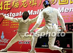 三月八日,中國“劍客”董兆致(左)在上海梅龍鎮(zhèn)廣場舉行的二○○四國際劍聯(lián)男女花劍世界杯大獎賽男子個人花劍決賽中,擊敗德國的Bissdorf Ralf獲得冠軍。作者:湯彥俊