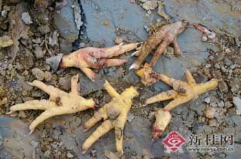 3月6日,廣西檢驗(yàn)檢疫局組織人員,兵分兩路,一路查看現(xiàn)場(chǎng)證實(shí)確有人動(dòng)過(guò)雞爪后,將現(xiàn)場(chǎng)作了消毒和封鎖;另一路與公安部門一起向舉報(bào)者了解情況。