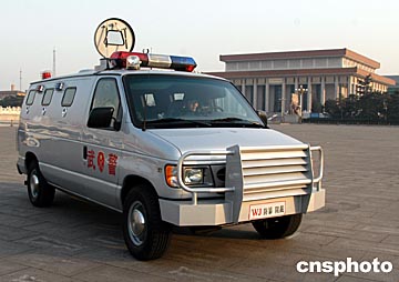 執(zhí)行“兩會(huì)”安全保衛(wèi)的武警新式防暴車(chē)在北京天安門(mén)廣場(chǎng)執(zhí)勤。中新社記者:張宇