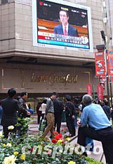 三月十日,香港特區(qū)政府財(cái)政司司長唐英年在立法會提交二零零四至零五年度財(cái)政預(yù)算案,圖為許多市民在時(shí)代廣場大屏幕前駐足聆聽。作者:潘索菲