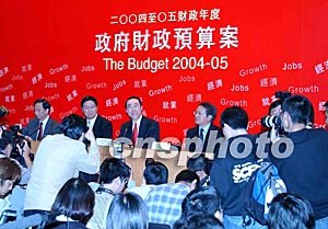 香港特區(qū)財(cái)政司長(zhǎng)唐英年3月10日發(fā)表任內(nèi)首份財(cái)政預(yù)算案,圖為唐英年宣讀財(cái)政預(yù)算案后出席記者會(huì)。作者:譚達(dá)明