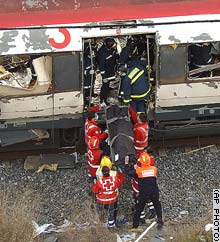 馬德里的3個火車站的4列火車遭到了爆炸襲擊。據(jù)西班牙警方稱,共有10顆炸彈被恐怖分子引爆,其中7顆在馬德里市中心的Atocha車站,1顆在Santa Eugenia車站,2顆在Pozo車站。