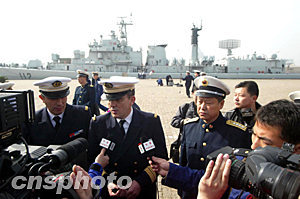 法艦進(jìn)港時(shí),碼頭舉行歡迎儀式。兩名兒童分別向“拉圖什特威爾”號(hào)反潛驅(qū)逐艦艦長阿蘭·克里斯蒂安和“比羅司令”號(hào)輕型護(hù)衛(wèi)艦長讓·夏爾獻(xiàn)花,北海艦隊(duì)副參謀長趙永青主持歡迎儀式并致歡迎詞。青島市外辦領(lǐng)導(dǎo)和駐青官兵200余人參加了歡迎儀式。